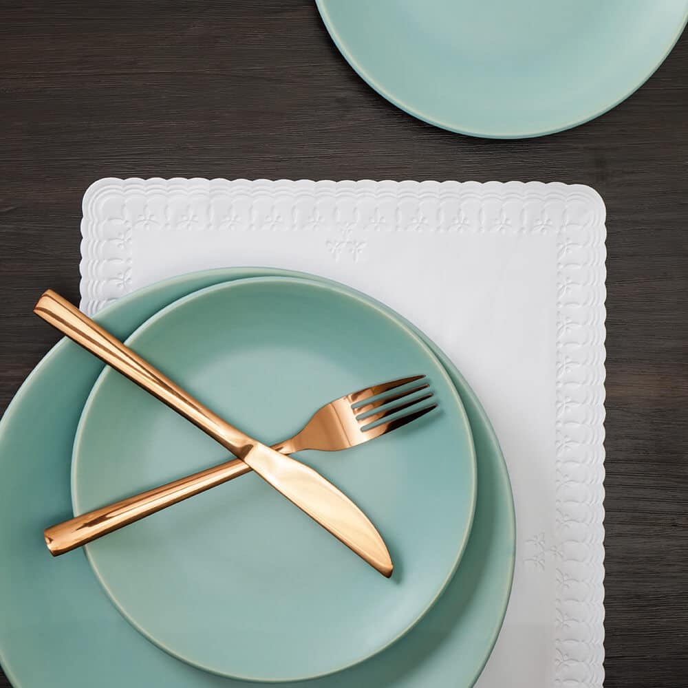 Nosso jogo americano é um produto clean. Seu fundo branco proporciona um ar de limpeza, além de visualmente dar mais destaque para seu jogo de jantar, mostrando mais os detalhes da louça e dos talheres.